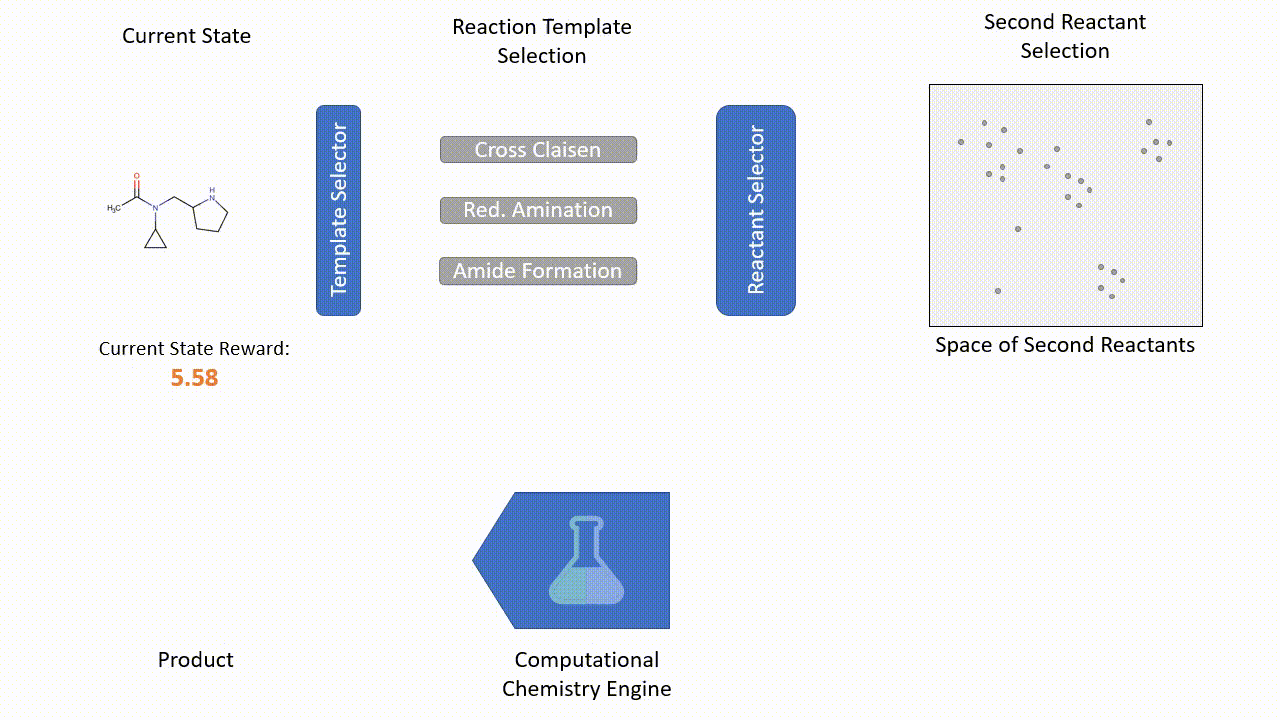 To navigate the chemical space efficiently, we propose an approach that considers a candidate drug as a sequence of chemical transformations applied to an initial molecule. Apollo 1060 is based on research we recently published at ICML that utilizes reinforcement learning, a subset of machine learning where software agents takes actions in an environment to maximize a given reward; in our case, to learn to select the best set of commercially available reagents and valid chemical transformations that maximize the desired properties of the product molecule. This guarantees that each molecule proposed by the system can be produced and also provides the corresponding reactions for production.